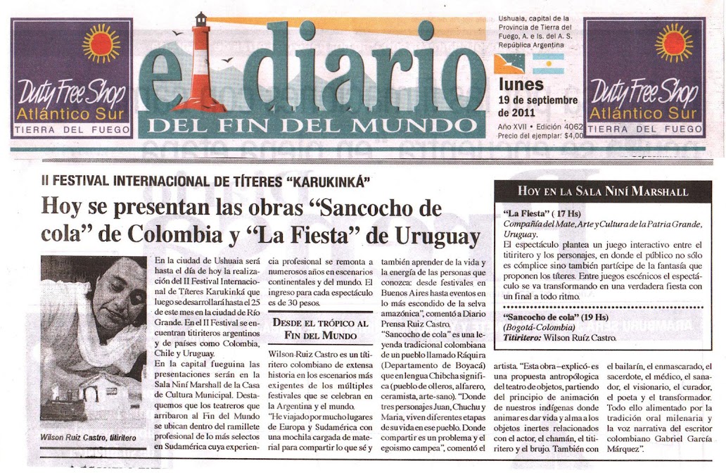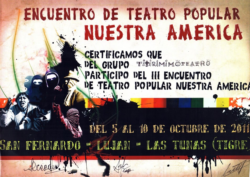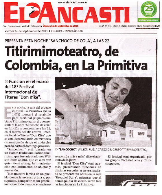 La Asociación TitirimimoTeatro, anduvo recorriendo Algunos países vecinos como Venezuela, México, Cuba, Ecuador, Perú, Argentina, Chile, Bolivia, Uruguay, Paraguay y Brasil con mucha alegría compartiendo lo mejor de sus presentaciones, arrancando aplausos y sonrisas de muchos amigos del arte, del teatro y de la vida, con la Obra Sancocho de Cola, la Asociación invadió cada escenario con personajes muy nuestros, de la tierra y de la esperanza..... Gracias a todas las naciones vecinas por recibirnos como suyos y permitirnos llevar el arte, el arte de nuestros pueblos a sus corazones, seguramente con mucha emoción volveremos a encontrarnos próximamente........