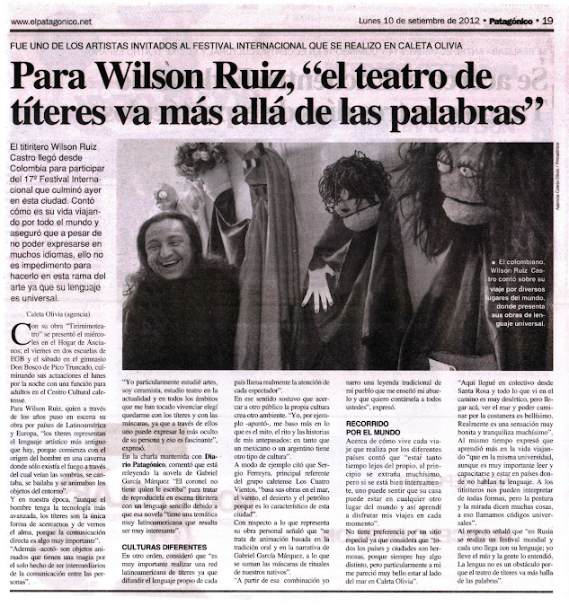 Wilson Ruiz Castro, actor y director Colombiano, quien ha encontrado en los personajes que el mismo encarna, desarrolla y da vida el mejor camino para revelar al mundo la idiosincracia colombiana, compartir su belleza, su realidad, nuestra realidad rodeada de mitos, de leyendas, de puro pueblo, y de lo autóctono, transfiriendole una estética, un modo narrativo particular y sobre todo acercandolo a todo tipo de publico, caracteristicas que el descubre dia dia y que lo hacen acreedor de un poder que solo los artistas pueden alcanzar, la libertad.....